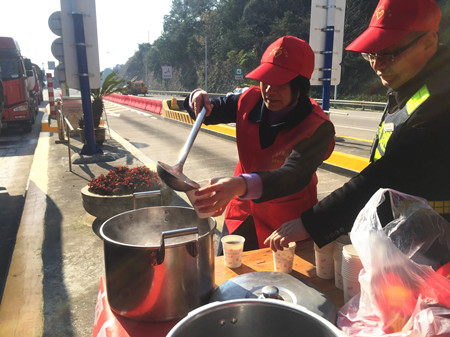 圖為工作人員在備熱飲品 當天是入冬以來最冷的一天,收費崗亭周圍氣溫達到零下4度。該所員工身穿耀眼的“紅馬甲”,面帶微笑,在車道安全島內搭起臨時“便民服務臺”,頂著嚴寒為過往司乘人員遞上一杯杯滾燙的姜茶與紅豆湯,并提醒司機朋友天冷注意保暖。 “姜茶暖我身、服務心貼心啊!”一位司機師傅接過姜茶不由地詩意起來。 “你們服務態度真好,有禮貌,充滿熱情,這么冷的天,能有一杯熱水是多么幸福的事情?。 绷硪晃凰緳C朋友一臉笑意地稱贊道。 他們的友好回應讓員工們忘了寒冷,也給了大家提供更貼心服務的動力。
