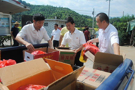 圖為臺州收費所黨支部人員正在搬下慰問品 在與村“兩委”領導親切座談時,慰問組一行對潘山頭村村容村貌有了新變化、村集體經濟有了新發展表示由衷高興。村“兩委”領導對臺州高速公路集團公司多年來的支持、幫助深表感謝,并表示將繼續團結帶領廣大村民,共同把潘山頭村建設得更加和諧美好。