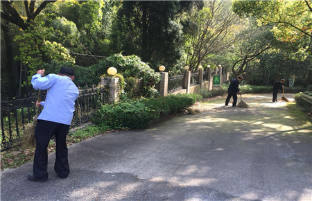 圖為執勤隊員打掃落葉