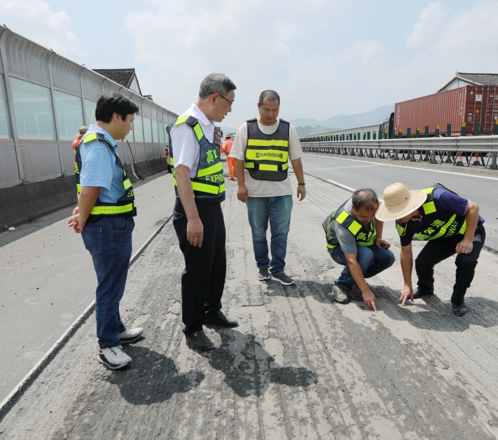 上午,臺州高速集團黨委書記、董事長、總經理陳文波,公司黨委委員、總工程師江輝,以及工程部相關人員一起來到公司所轄路段,檢查施工進展情況。