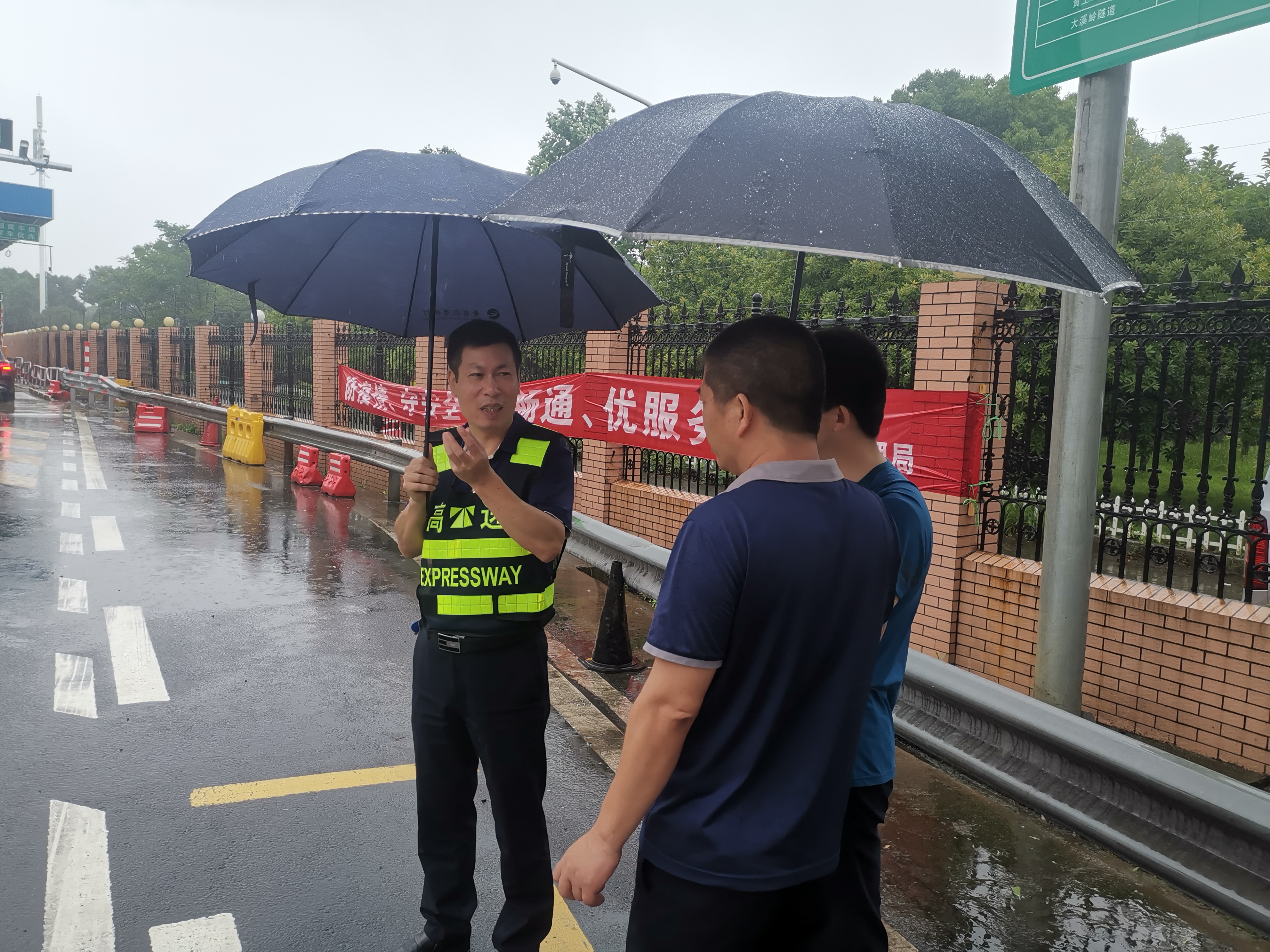 圖為江輝在臺州收費站檢查 江輝一行走訪了沿線收費所,檢查各收費站路口執勤人員24小時到崗及服務情況,對車輛的引導及突發事件的處理情況等,要求確保收費站入口管控工作到位,車輛安全裝載及正常有序通行。