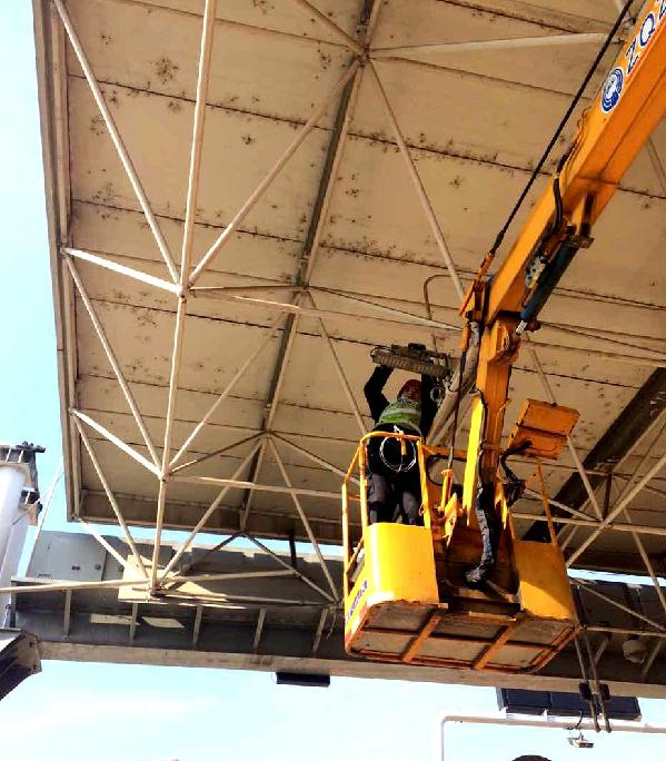 圖為隊員正在更換車道頂棚燈 期間在臺州南收費所發現有兩個車道出現異常,即當重型車輛通過時,輪檢鐵板和稱臺出現不正?;蝿忧闆r。根據以往經驗,此情況如不進行及時維修,對車輛計重將造成嚴重影響。對此,技術人員不僅對鐵板上每顆螺栓都進行了認真細致的重新加固,之后不厭其煩對每個稱臺限位都進行了多次調整,直至將晃動幅度控制在正常范圍內。