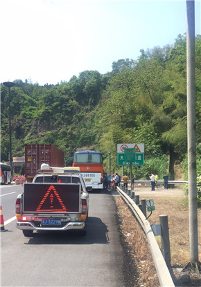 見狀,巡邏車馬上開啟預警模式,指揮大客車緩慢駛入北廣場。隊長李新波詢問原因得知,浙J**123是椒江開往楠溪江的旅游包車,途中發動機故障,失去動力,車子開不了,現正在聯系公司,讓公司派車。但車子停在應急車道,行人肆意穿越隔離帶很危險,高速公路車多速度快,隨時可能發生意外。對此,執勤隊員當即帶領乘客轉移安全地帶等待,告知他們在高速公路上不得隨意穿行。