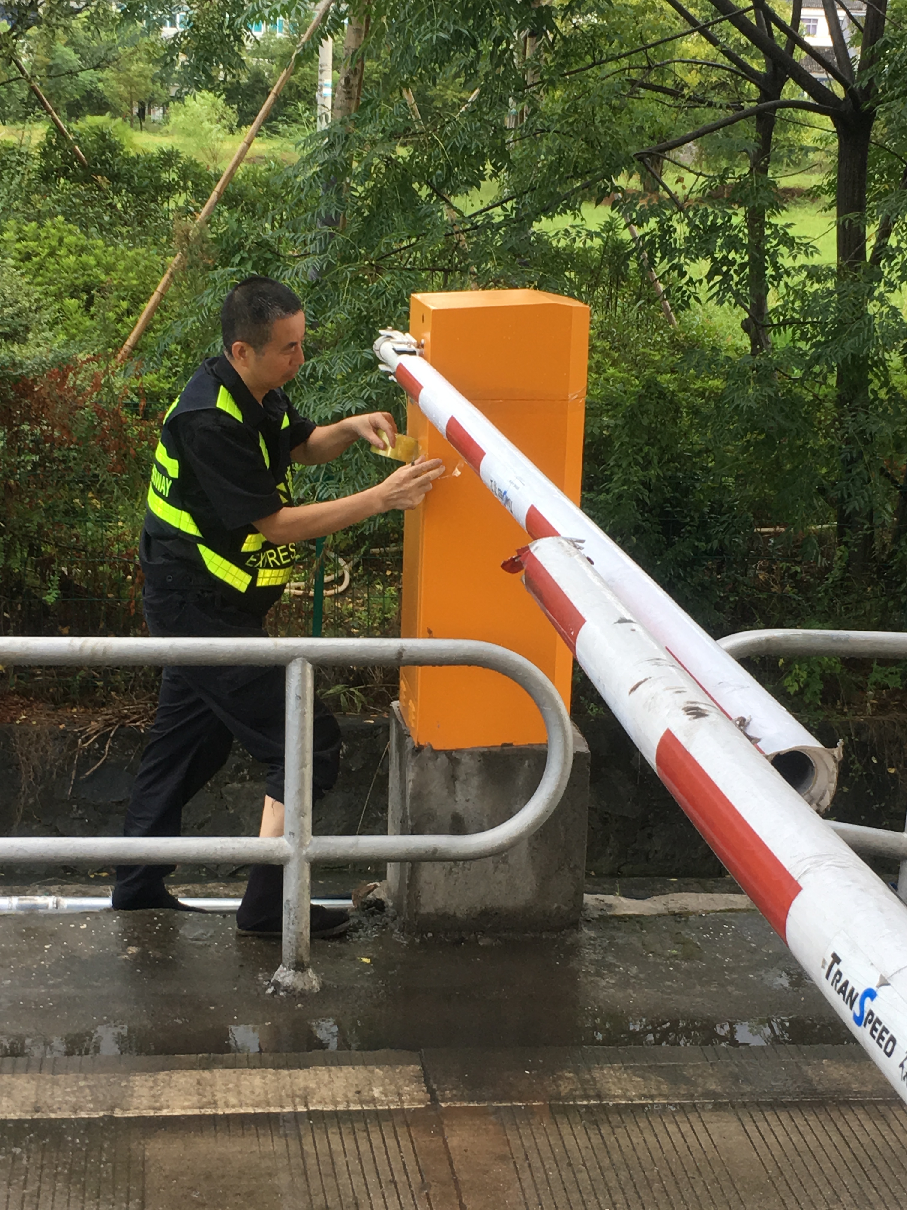 圖為工作人員下降各收費所互通區高桿燈 增強機電設備防水措施。集團收費站有很多機電設備直接安裝在戶外,因外層有開關柜保護,一般雨水是無法滲透的??梢坏┯錾吓_風雨等惡劣天氣就很難確保內部設備不會被打濕,尤其是計量柜里面的計重設備,一旦短路損壞會立即造成車輛擁堵。因此,剛完成高桿燈下降工作的中心隊員顧不上休息,又馬不停蹄趕赴收費所將計量柜、欄桿機等重要設備用封帶紙進行密封處理,不漏過任何一處可能進水的地方,大大增強了這些設備防水性能。