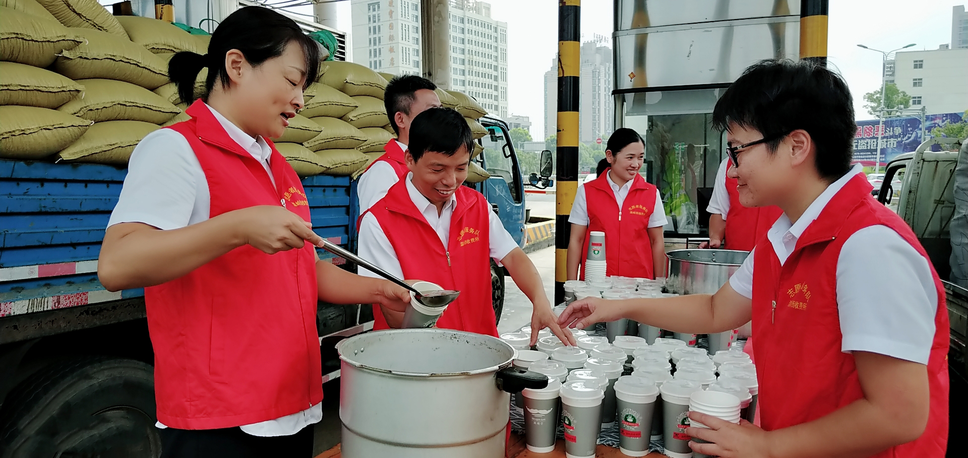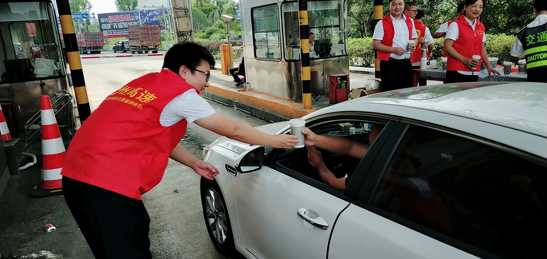 圖為送清涼活動現場 “師傅,你好,喝一碗冰綠豆湯解解暑吧。” 溫嶺西收費所、大溪嶺隧道所黨員帶頭,團員響應,大家主動放棄休息時間,組成志愿服務隊,頂著高溫在高速出口處為過往司乘免費提供綠豆湯、紅棗湯等飲品,同時還備足藿香正氣水、風油精等解暑藥品,讓廣大司乘在炎炎夏日感受到一絲清涼。當司乘人員從志愿者手中接過一杯杯綠豆湯時,志愿者還不忘提醒司乘高溫酷暑天氣注意行車安全。面對“春風”般微笑的志愿者,喝著綠豆湯的司乘人員都露出了開心的笑容,紛紛豎起大拇指感謝志愿者們的貼心服務。