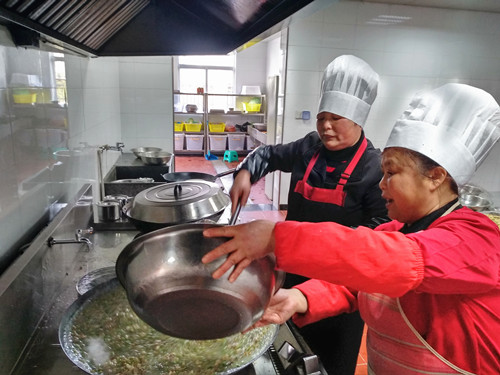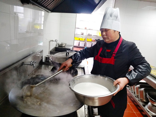 浸了一夜的早米,用石磨磨成米漿,細膩而幼滑,被靜置在盆里?!耙话愣加妹追叟菟?,口感粗糙,而且吃起來沒有香頭?!崩ㄒ贿呎f,一邊將香腸切碎與豆腐、冬筍、胡蘿卜、芹菜、香菇、蠶豆瓣翻炒著。旁邊的大鍋里,長長的豆面在骨頭湯里翻滾著,像一棵棵舞蹈的海草。徐徐倒入的米漿,被不停地攪拌,“要是粘到鍋,就會有焦糊味,這鍋羹就算廢了。”米漿好像不夠,利花有些懊惱,“要是在家里,米漿都會多準備一些,不夠就隨手添,我帶到這里就這些,也沒得加了。”就叫在一邊做幫手的妹妹寶花用面粉和山粉(也就是番薯粉)摻水拌起來,倒入鍋里,湯漸漸濃稠起來,倒入之前炒好的配料,加上切得細細的綠綠的芥菜梗、芥菜葉、海蠣,鍋里不時冒起大泡,香氣四溢。 為照顧吃不慣糟羹的同事,食堂還準備了一鍋甜的山粉糊。來自臺州各縣市區的同事,按各自飲食習慣選擇了咸的或甜的。有說芹菜的味道蓋過了芥菜清香的,有說沒有加入芋頭口感不夠糊的,但撲鼻的香氣和濃厚豐富的口感立刻讓人忘了挑剔。對我來說,碧綠的芥菜葉和白胖的海蠣肉是整碗羹的顏值擔當和靈魂所在。 每個元宵節,對于在崗的同事們是沒有花燈可看、沒有燈謎可猜的,也不能與家人聚在一起吃羹。車道上此刻正是流量高峰期,大家匆匆吃完,都要趕著上崗。食堂大姐把多出的糟羹和山粉糊放進蒸飯鍋保溫,叮囑大家下班后再來吃點,這個吃了不扛餓。此時,除了食物最能體現節日氣氛外,還有那一份特意為你留著的溫熱更讓人感動。 鄭瑛芝