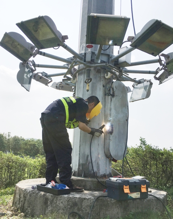 圖為張鵬在焊接被臺風刮掉的高桿燈電箱門