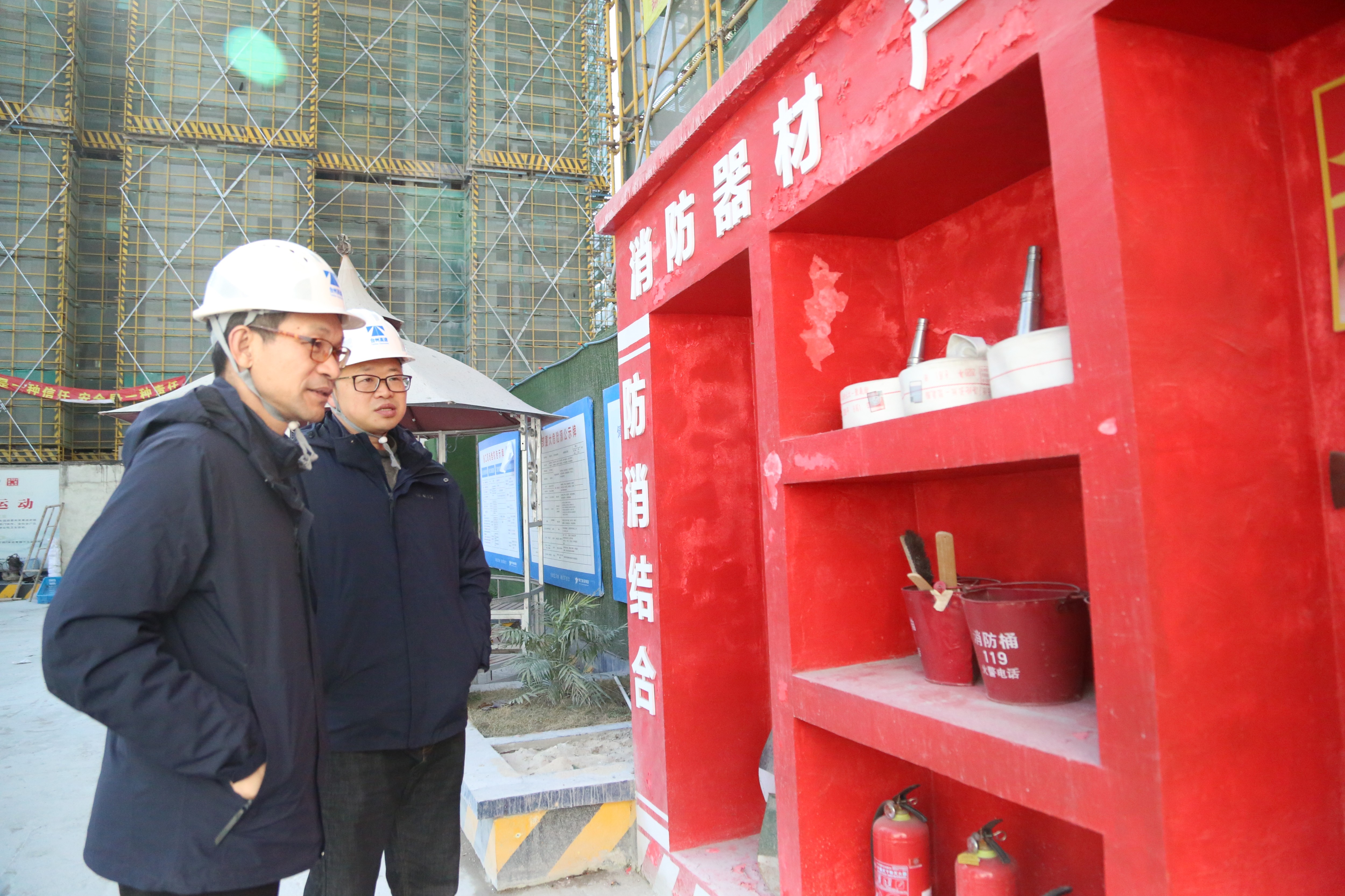 圖為檢查組在玖璽項目工地檢查消防設施 檢查組一行來到了高速玖璽逸墅銷售展廳,對展廳內舉辦的各種“迎新年活動”表示肯定,同時提醒銷售部要跟進配套安全措施,近日寒潮來襲,更要注意防寒防凍。 項淑珍